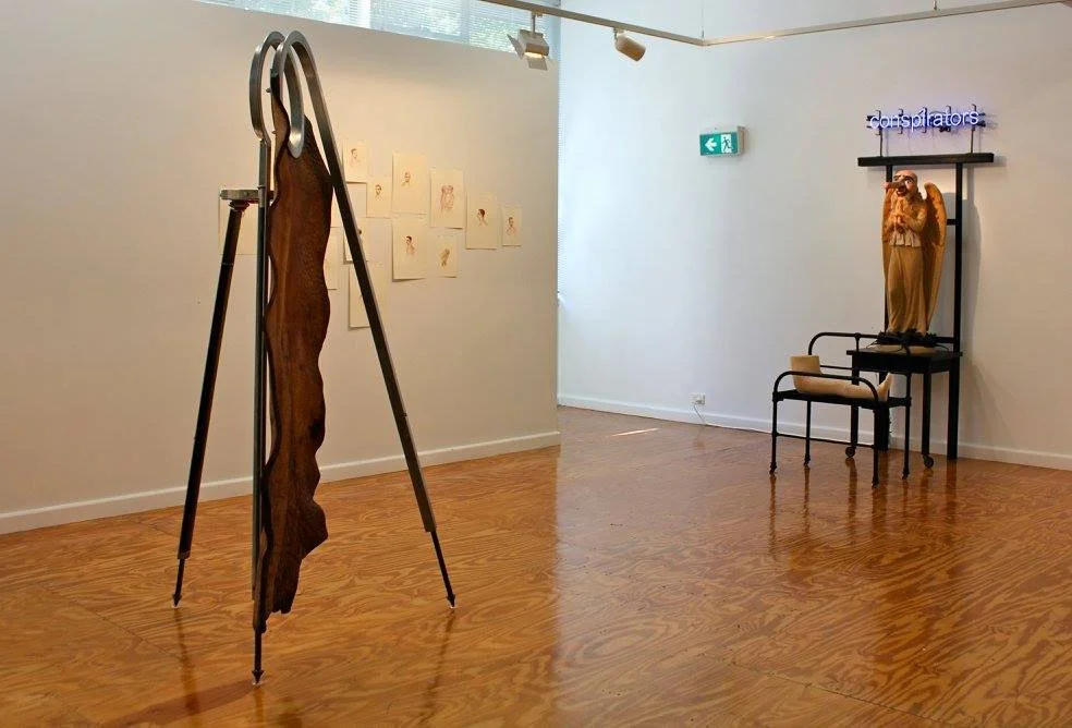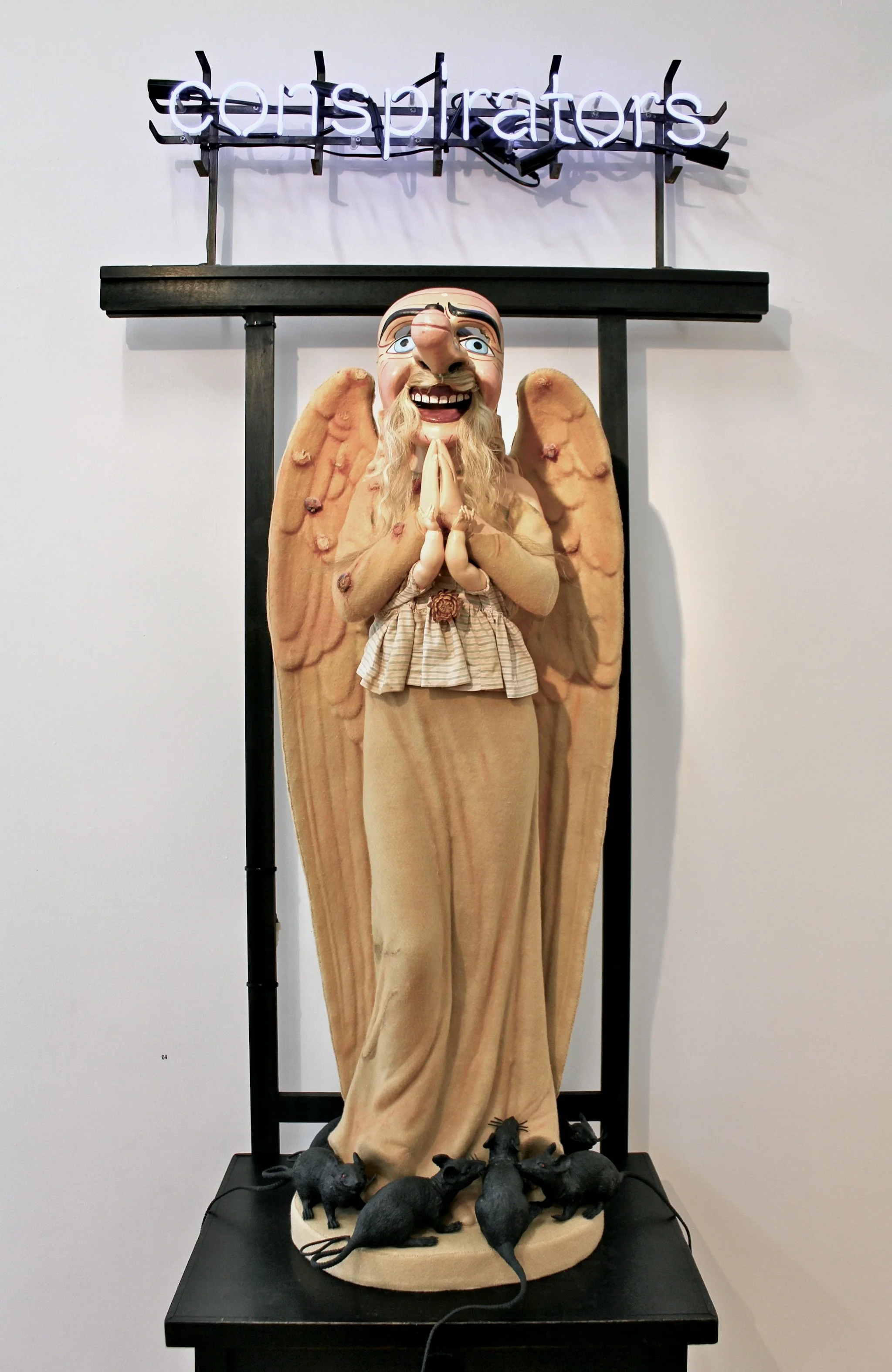 Recycled cast iron bed, wood, ceramic, steel, felt, Peruvian festival mask, acrylic, enamel paint, fiberglass, and neon